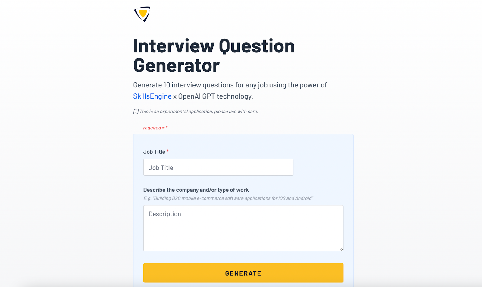 2. Generate Questions: Click "Generate", and the tool will instantly provide 10 interview questions based on the job title and description, leveraging SkillsEngine x OpenAI GPT technology.